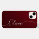 Burgundy Red Shimmer White Elegant Calligraphy Script Anpassningsbar Namn iPhone 14 Smart Phone Case har en modern och enkel design för trendig och snyggt med din personlig namn i Personlig-handskriven calligraphy script typography on a metallic burgundy red shimmer-bakgrund. Designad av ©Evco Studio www.zazzle.com/store/evcostudio