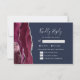 Det moderna djurutrymmeskortet i elegantens lämnat kant har en burgudisk vattenfärgad agate i gräns som trimmas med faux silver glitter. Rubriken "Kinely Reply" visas i handskriftsskriptet silver grått, med resterande text i textblock och kursivt typsnitt på marin blå bakgrund. Innehåller utrymmen där gästerna kan börja välja mellan tre redigerbara poster. Den bakomliggande sidan har en matchande burgundi och silver-agate-design.
