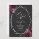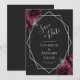 Det här moderna bröllop spara datum-kortet i elegant har ett silver-geometriskt ram som dekoreras med burgundi och silver blommigt buquets på en svart bakgrund. I anpassadet kombineras silver grått med fysisk handskrift, tryckplåt och kursivt typsnitt. Den omvända sidan är solid off-black.