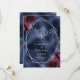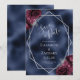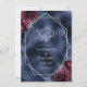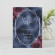 Det här moderna bröllop spara datum-kortet i elegant har ett silver-geometriskt ram som är dekorerat med burgundi och silver blommigt buquets på en marin blå folie. I anpassadet kombineras silver grått med fysisk handskrift, tryckplåt och kursivt typsnitt.