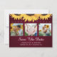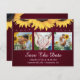Rustik burgundy blommigt bröllop förlovning fotocollage sparar datumkorten med solblommor och snöre på en burgundisk gradientbakgrund. Anpassa det här kortet enkelt med information om bilder och bröllop, inklusive en webbplats för bröllop. Matchande objekt är tillgängliga.