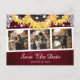 Anpassad burgundy och solros bröllopsfoto spara datum vykort med en fotokollage på en rustik träd bakgrund med solrosor, blomster spetsar och sträng ljus.