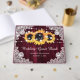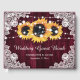 Komplettera din burgundiska rustiska bröllopsfest med den här burgundy- och solrosgästen bröllop bok med solrosblommor och vit blommigt snöre på en rustisk träbakgrund. Matchande objekt är tillgängliga.