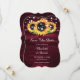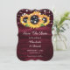 Rustiska burgundi- och solroskort från bröllop spara datum med solblommor på träbakgrund, försedd med strängen ljus. Två stövlar på baksidan. Matchande objekt är tillgängliga.