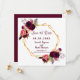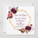 En elegant och romantisk bröllop Spara datum-kort. En falsk guld-färgad geometrisk formad ram med bohemisk, boho-stil vattenfärgade rosor, blommor i burgundy och rosa. Mallar för dina namn, datum och plats för bröllopet. Vit bakgrund på framsidan. Burgunderfärgade bokstäver.