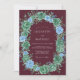 This design features a rich burgundy backdrop adorned with an abundant wreath of soft green succulents and delicate blue blossoms. The overall aesthetic evokes a romantic, naturalistic feel, perfect for an elegant outdoor or botanical occasion.