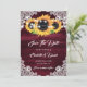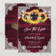 Burgundy and sunflower wedding save the date card featuring sunflowers and delicate floral lace against a rustic wood background.