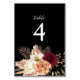 Lägg till djärv elegans till dina bröllopsbord med detta romantiska blommiga bordnummerkort. Den dramatiska svarta bakgrunden framhäver mjuka akvarellblommor i burgunderrött, elfenben och persika – perfekt för stämningsfulla höstfiranden eller eleganta boho-bröllop. Ett stilrent sätt att guida gästerna till sina platser.