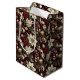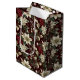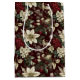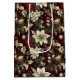 White poinsettias, red berries and silver ornaments abundantly cover a deep burgundy background in this classic Christmas floral print gift bag