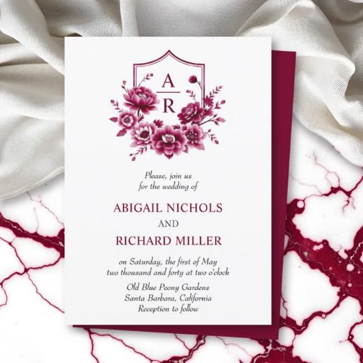 Burgundy-blommigtens vapensköld med initialer bröllop OSA Card med QR-kod. I OSA kort i elegant bröllop förenas porslinernas konst med den traditionella kinesiska estetikens elegans. Med en blommigt vapensköld som är försedd med peonier som framkallar den klassiska bläck-målningens charm, fångas en känsla av romantik och sofistikering. De ömtåliga blommorna presenteras i burgundi, rosa och mjuka vita nyanser. Dessutom innehåller baksidan av biet en QR-kod för lämpliga RSVP-onlineer.