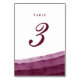 Burgundy vattenfärgskort i bordsnumret bröllop, som ingår i vår moderna pappersinsamling i bröllop som är färdigt för dipfärgning. Med skuggor av marsala lila/röda påminnelser om vin och vinodlingar, som appliceras i pansardrag med rik vattenfärgstvättar, och som överensstämmer med enkel klassisk text.