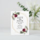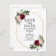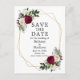 Modern Elegant Watercolor Burgundy Blommigt Förlovning Bröllop avisering Spara Postkort för datum inkluderar peonier, lök, eukalyptus löv och annan vacker storenergi på ett guld geometriskt ram.