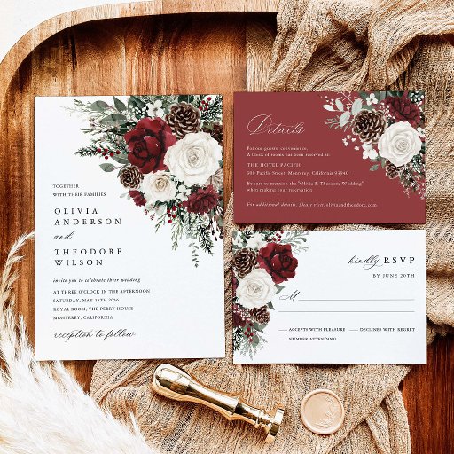 A refined burgundy winter floral wedding details card designed to share essential information such as hotel accommodations, travel details, and guest arrangements. Featuring rich burgundy roses, soft ivory blooms, and elegant greenery with subtle pinecone accents, this card maintains a cohesive and timeless winter wedding aesthetic while keeping your information clear and beautifully organized.