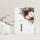 Elegant burgundy winter floral table number cards featuring refined typography and romantic botanical artwork with roses, pinecones, and seasonal greenery. Designed in a modern classic layout, these table numbers provide clear table identification while enhancing your reception decor with a cohesive and sophisticated aesthetic. Perfect for winter weddings, holiday celebrations, christmas weddings, and rustic elegant venues, these cards seamlessly blend functionality with timeless floral design.