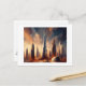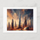 Ett surrealistiskt citysslande har skyscraper med ljust, strålande färg, som framhäver en stadscen i futuristiskan. Den centrala högstiga upp dominerar skylten, omgiven av ett dramatiskt himmel med en känsla av energi och rörelse.