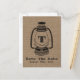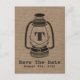 En bröllops inbjudan med en illustration i helsvart av en camping-stil oljeljusstake på en burlap inspirerad bakgrund. Personifiera med er monogram. Anpassa texten på framsidan och baksidan.