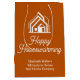 This professional realtor gift bag is custom made with your real estate company name under the modern cursive script for an open house. These customized burnt orange realty business promotional gift bags feature a house logo image for home builder or realty agent company marketing.