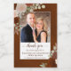De här miniatyrmärkena vin är perfekt för använda som bröllopsfavoriter eller som ett tillägg till en svag väska för medlemmar av brudens sida. Utformningen har ett foto som är omgivet av handmålat vattenfärg ro i skuggor av rost orange, brinnande antal och korallpersika. Rubriken lyder: Tack för att ni firar med oss, med parets namn, bröllop-datumet och typen av vin eller annat flaska innehåll. Konstruktionen av blommigten för rustiska vattenfärger är perfekt för fall eller höst bröllop.