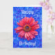 Min ursprungliga digitala grafik med mitt originalfoto av en röd Gerbera-daisy-blomma finns på det här söt blommigtens födelsedagskort. Bilden bearbetades med en vattenfärgsfantasi för ett illustrerat och vismiskt utseende med blå daisy i bakgrunden. Stater "Grattis på födelsedagen!" på kortets framsida och insidan av kortet stater "Hoppet denna dag blommar med stor glädje!" Ett underbart kort för alla typer och blommor i älskare.