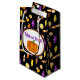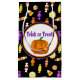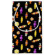 Den här Halloween-pappra presentväskan har en söt godis mönster på svart bakgrund och hälsning "bus eller godis" i lila glitter. En festlig Helgdag-väska med mera.