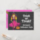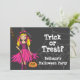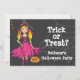 Roligt tjejer Halloween fest inbjudan. Med en söt flicka klädd som en söt häxa med en pumpa och en pjäs. Anpassa med ditt namn, uppgifter om party, adress och OSA. En unik designad illustration och design från Sarah Trett.