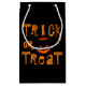 "Bus eller godis" Halloween-bild med glödande, karvpumpad pumpa på liten presentväska.
