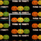 Denna struktur har tre jack-o-lyktor sitta i rad med texten "Bus eller godis?" nedan. Pummorna är orange, guld och grönt med tydlig bakgrund så att du kan välja en alternativ bakgrund för färg. Den vita texten är skisserad i en tunn orange för att hjälpa ord att framträda bättre på vissa färger i bakgrunden.
