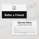 Framsida: Den här blankettmallen för svartvitt har en visning på det vita rand längst upp. Du kan ersätta visningen med företagets logotyp. Det finns en vit visning på det svarta rand vid grund. Om du vill kan du redigera texten. (Visa: Se en vän). Tillbaka: Den stora svarta texten överst kan redigeras för att visa ditt företag namn eller ett anpassningsbar-meddelande. Nästa linjer är din gatuadress adress, mobilt nummer eller annan kontaktinformation. Dessa kort har också linjer till skriva för vännens namn och namn för den kund som gjorde hänskjutandet. I grund finns det text som du kan redigera för att spegla villkoren i ditt erbjudande. All text kan redigeras eller raderas efter behov.