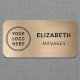 Professionell namn bricka med ditt företags eller din organisations logotyp mot en borstad guld-fack av metall. Lägg till namn och titel/position i enkel typografi.