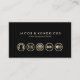Affärskortet för uthyrning av audio har en svart bakgrund i jet. Fem guld-ikoner som är relaterade till audio visas på kortets nedre halva, där namn och tagg eller text visas med fet stil på den övre halvan. Din kontaktinformation visas på baksidan av kortet. De små ikonerna skapar en mycket imponerande professionell.