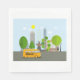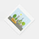 En skola buss med staden i bakgrunden. Den här designen ser ut att vara effektiv på dessa Pappra servetter