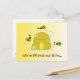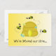 En söt design med en bikupa med tre små buzzande bin och blommor runt den. "vi har flyttat vår kupa" anpassas nytt adress på baksidan..