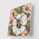 The square clock has a cute bee busy gathering pollen for the day there is peach pink back round and flowers.