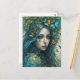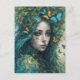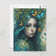 En kvinna med blått hår är omgiven av fjärilar och löv och skapar en mystisk och eterisk atmosfär. Hennes livliga uttryck och det vibrerande färg förmedlar en känsla av harmoni med naturen.