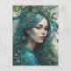 En kvinna med flytande turkoshår omges av vibranta blå fjärilar, som skapar en eterisk och drömliknande scen. Hennes serenuttryck kompletterar lövens naturskönhet och rörelse som är sammanvävd med hennes hår.