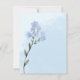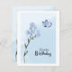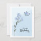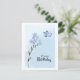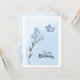 Ett härligt födelsedagskort med en delikat blå fjäril som flödar i ett kluster av pulserande blåa blommor. Bakgrunden är en lugnande skugga av blått. Kortet innehåller även meddelandet "Grattis på födelsedagen" i ett svart, kursivt teckensnitt.