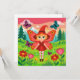 A vibrant and playful 2D cartoon illustration featuring a young fairy with large, red-patterned butterfly wings. The character wears a tall red pointed hat, a matching red dress, and polka-dot tights, floating in a lush green meadow. The scene is filled with oversized colorful flowers and fluttering butterflies, set against a background of evergreen trees and snow-capped mountains under a warm sunset sky.