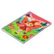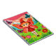 A vibrant and playful 2D cartoon illustration featuring a young fairy with large, red-patterned butterfly wings. The character wears a tall red pointed hat, a matching red dress, and polka-dot tights, floating in a lush green meadow. The scene is filled with oversized colorful flowers and fluttering butterflies, set against a background of evergreen trees and snow-capped mountains under a warm sunset sky.