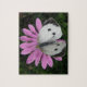 Det här fantastisk-pusslet har ett foto av en stor vit fjäril, även känd som en kål vit fjäril, sitta på en vacker purpisk färgad afrikansk Daisy-blomma av rosa. Smörflyget har sitt vingar öppet och avslöjar sina vackra markeringar.