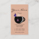 En dramatisk illustration med svart te kopp, lila teabag och lila och blå fjäril.