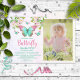 Söt och omtyckt fjäriltemaflickans födelsedagsfest inbjudan. Med ett vackert gäng vattenfärgblommor och pastellfjärilar plus födelsedagsflickans foto bredvid alla detaljer om party.
