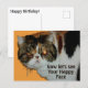 Nu ska vi se Ditt glada ansikte, säger denna grinig exotiska korthåriga perserkatten på detta söta och roliga vykort. Den här grumpy katten är säker på att sätta ett leende på alles ansikte oavsett tillfälle för födelsedagsönskningar eller bara en vardaglig Hej. Denna inte så glada vita svarta och bruna katt har "Katt-itude" Attityd. All text är anpassningsbar och "Grattis på födelsedagen" kan ändras med din egen hälsning. Detta är originell fotografering av JLW_PHOTOGRAPHY trots kattens invändningar.