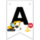 Bygget tog födelsedagsbuntning i flaggor med en vit bakgrund, med söta tecknader av buntning, stoppskyltar, lastbil, grävare, cement lastbil, en förstörande boll-kran, stänk av smuts och ordspråket "grattis på födelsedagen".