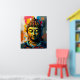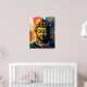 En närliggande porträtt i Buddha, målad i ett vibrerande och abstrakt stil, skildrar sin lugn ansikte, med ett milt leende. Bakgrunden är en blandning av färgstarka penseldrag och stänk som skapar en känsla av energi.