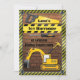 Anpassade personliga bygg- och anläggningsfirman-inbjudningskort för pojkar för födelsedagsfirande för bebisar eller barn 1:a, 2:a, 3:e, 4:e, 5:e, 6:e, 7:e, 8:e, 9:e, 10:e, 11:e födelsedagsfester. Söta dubbelsidiga inbjudningar i coola gula och svarta färger med vektorillustrationer grävmaskiner / bulldozers / grävskopor, och arbetare / byggare hantverkare byggverktyg:- sågar, skruvmejslar och hammare. Även byggband, en trafikkon och en tegelvägg bakgrund med bygg-ränder kant med skruvar / skruvhuvuden. Dessa roliga, funkiga, byggar-inbjudningar för pojkar till barnkalas är dekor