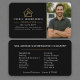 Lyxig svart och guld affärskort designad för yrkespersoner inom byggbranschen med en djärv fotolayout. Skapad för att visa upp ditt arbete samtidigt som den förmedlar styrka, kvalitet och professionalism. Perfekt för entreprenörer, byggare och byggföretag som vill göra ett kraftfullt första intryck och attrahera nya kunder. Redigerbar text och foto. Ren utskriftsklar layout.