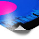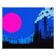 Ett komplext industrilandskap framställs med en silhustru mot en grönt himmel. En fet blå cirkel står i kontrast till de texturerade molnen i bakgrunden.