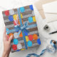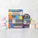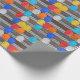 Det här omslags papper har ett mönster av byggnadsarbetares säkerhetshjälmar. Många olika hjälmar hänger på en korrugerad metallvägg, precis som på en byggarbetsplats. Du kan göra detta mönster på detta omslagspapper större eller mindre. Detta gör en bra presentinslagning för arbetsmiljö eller förpackning för byggföretags kampanjgåvor.