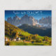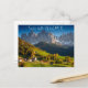 Postkort med byn St Magdalena med kyrkan i Villnoesstal i Sydtyrolen, Italien, under höstsäsongen med bergen Geisler Dolomites i bakgrunden med den italienska texten: "Saluti dalle Dolomiti", "Hälsning från Dolomiterna".