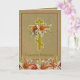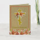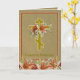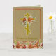 Vacker byzantinsk katolsk-ortodox krucifix påsk Pascha-kort med Kristus är uppstånden - Christos Voskres med liljor och en gyllene bakgrund